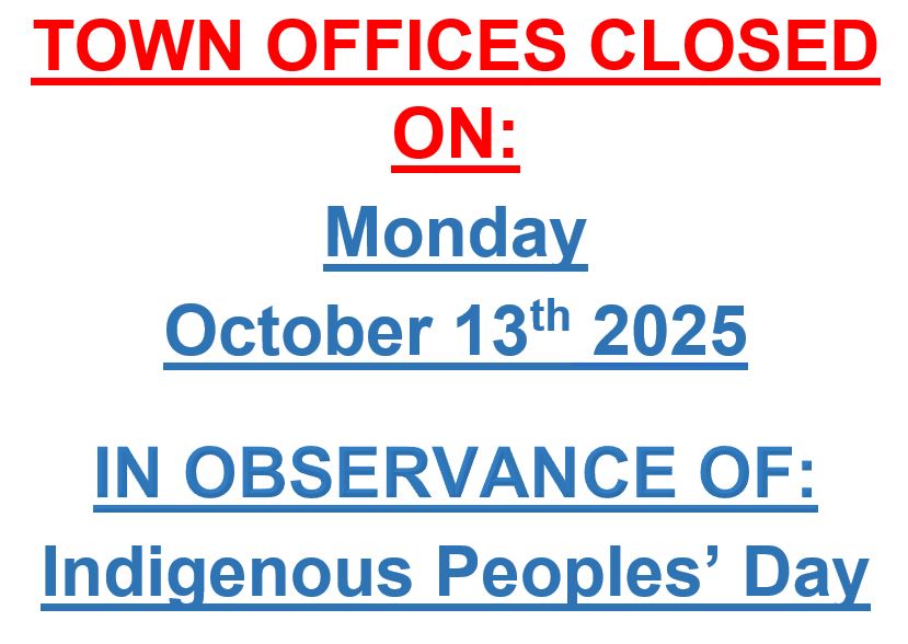 Please note the Town Offices will be closed on Monday October 13th 2025 in observance of Indigenous Peoples’ Day (F/K/A Columbus Day)