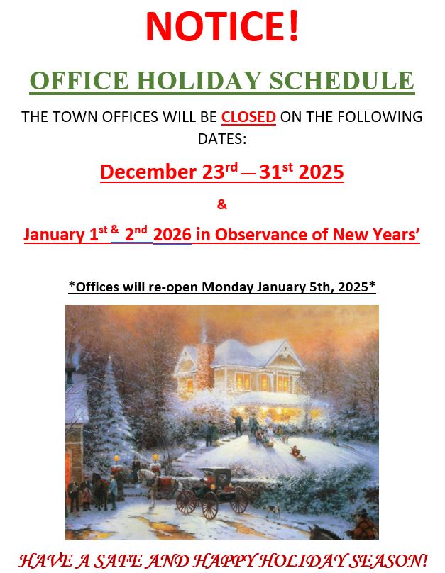 As we head into the season of Holidays for December please see the following Notice regarding our last scheduled closure of 2025! It is hard to believe 2025 is almost over! Please plan your trips accordingly, utilize our outdoor drop-box for tax/water payments, mail your document submissions to our PO Box, or explore the many services and resources we provide online!
